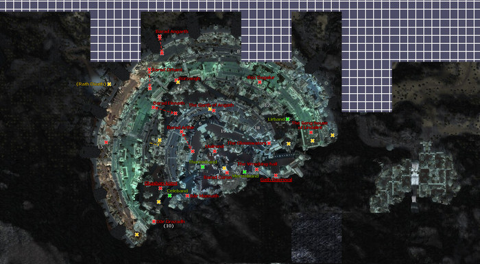 Trouvez les 18 points d'intérêt de Minas Morgul (les cercles 1 à 4 sont les cercles indiqués sur la carte. Le cercle 5 correspond à l'endroit où l'on arrive par Barad Arthir, avec les cultistes et les Curonguls, et le cercle 6 au niveau de la Citadelle) :