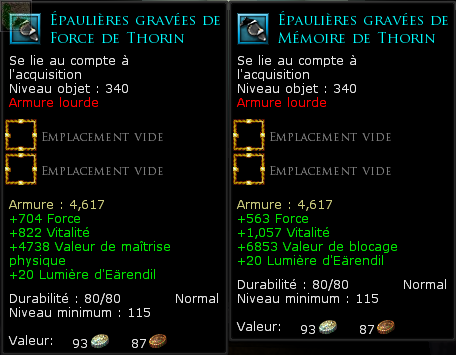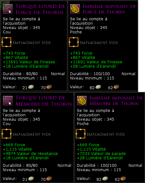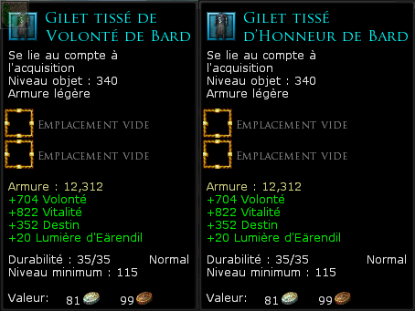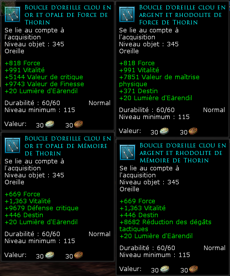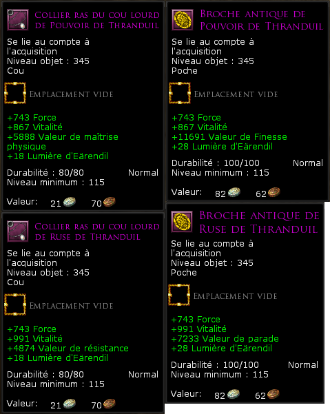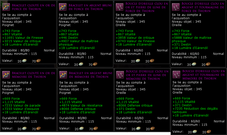 Les boucles d'oreille bleues sont les meilleures pouvant être obtenues à la sortie de la Mise à Jour 22 pour tout le niveau 115. Les colliers et poches arrivent ex aequo avec les équipements des recettes uniques du Mordor (nécessitant un Fragment de l'Abîme).
