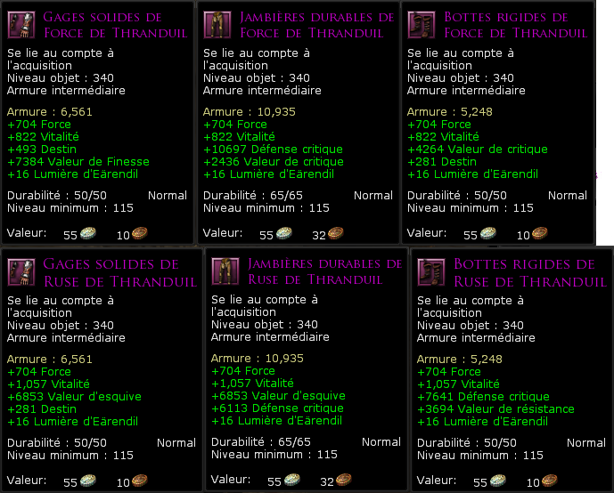 On trouve des armures violettes et bleues (niveau 340) au travers des quêtes et des trois réputations de la MàJ 22 (chaque réputation donne une stat : les Nains pour les armures lourdes, les Hommes pour les armures légères, et les Elfes pour les armures intermédiaires).