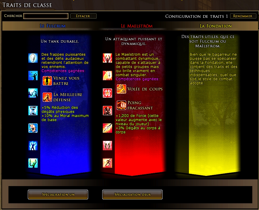 Chaque classe dans le jeu à sa disposition 2 ou 3 arbres de traits de compétences représenté par un code couleur soit, de gauche à droite, bleu - rouge - jaune. Si l'arbre rouge représente pour toutes les classes, les compétences de dégâts, les fonctions des arbres "bleu" et "jaune" peuvent varier. C'est le cas ici, avec le bagarreur, qui a un arbre de compétence "jaune" uniquement destiné à venir renforcer les arbres "bleu" et/ou "rouge". À partir de là, le joueur aura à dépenser un certain nombre de points dans les arbres de traits, au fur et à mesure des dépenses, les bonus de traits vont se débloquer.