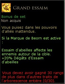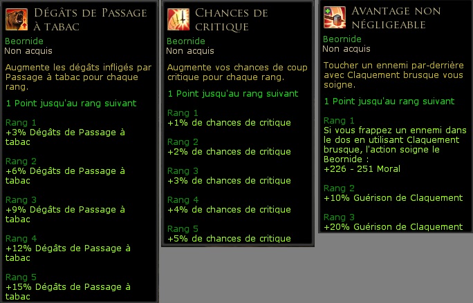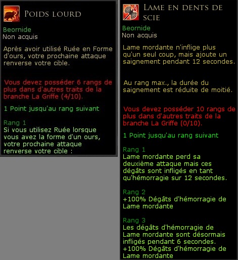 Chaque classe dans le jeu à sa disposition 2 ou 3 arbres de traits de compétences représenté par un code couleur soit, de gauche à droite, bleu - rouge - jaune. Si l'arbre rouge représente pour toutes les classes, les compétences de dégâts, les fonctions des arbres "bleu" et "jaune" peuvent varier. Ici, avec le Beornide, le bleu représente le tanking, le rouge les dégâts alors que le jaune est destiné aux soins. Il existe donc 3 façon de jouer son nounours.