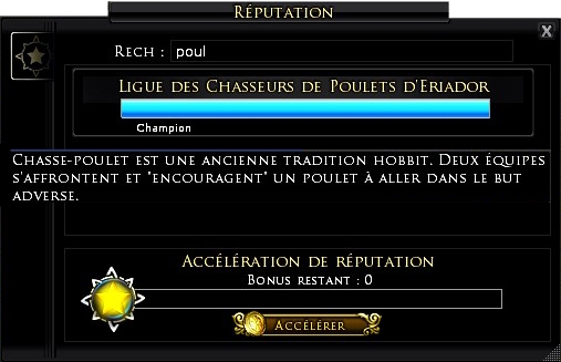 Une réputation est à faire auprès de la Ligue des chasseurs de poulet d’Eriador. Suite à un match tout les participants reçoivent 700 points de réputation