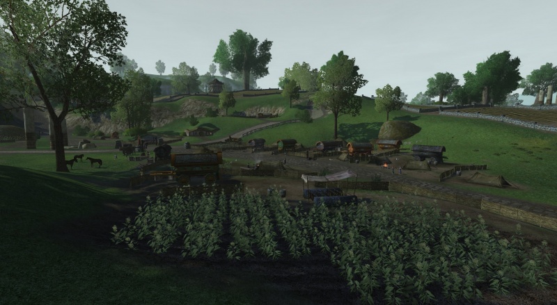Comme son nom l'indique, le village hobbit du Carrefour se trouvait à l'intersection de trois routes : la grande route vers Grand'Cave à l'ouest et le Pont du Brandevin à l'est, la route du Pays de Touque au sud et la route de Petite Cave au nord. Son importance n'avait pas échappé aux brigands de Sharcoux, qui y avaient établi des baraquements.