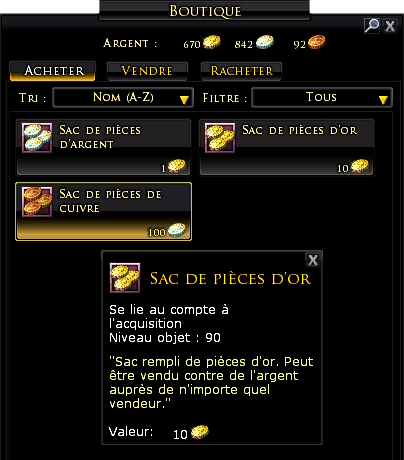 - Récupérez un Sac de pièces d'or (pour 10 pièces d'or du jeu auprès du gardien des coffres à 9.8 S, 125.9 O)