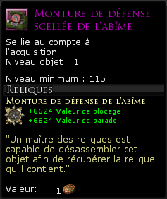 Avec la MàJ 21.3 et l'arrivée du raid de l'Abîme de Mordath, d'autres reliques ont été ajoutées, qu'on peut looter dans le raid ou bien avoir contre 700