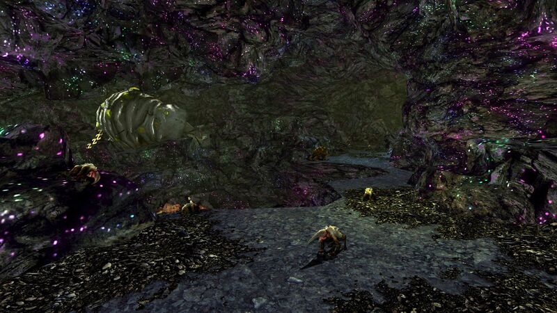Je vous raconte pas comment j'ai du éclaire cette photo artificiellement pour y voir quelque chose. Cette grotte à 33.9 N, 57.6 O est pleine de grifferoche et oui... faut en tuer quelques unes pour une quête. Comme d'habitude, les quêtes terminées on y revient plus jamais.