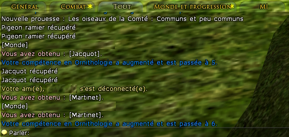Il faudra utiliser une compétence de loisir spécifique appelée Ornithologie pour commencer votre recherche et trouver des oiseaux. Retrouvez la compétence dans votre panneau de loisirs (en cliquant sur l'onglet Loisirs sur la page de votre personnage, voir photo dans le paragraphe de présentation) et faites-la glisser vers un espace disponible dans votre barre de raccourcis.